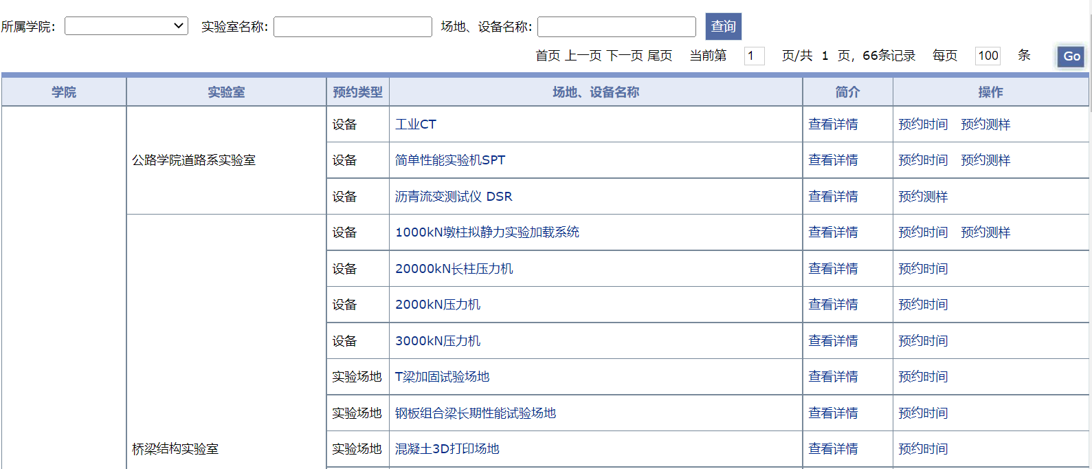 用户可按学院、实验室、资源名称查找要预约的资源,查看资源详情,填写预约单,对于支持送样测试的设备,可预约测样。如下: