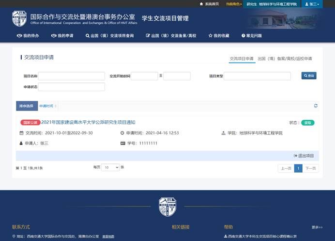 学生出国(境)管理模块包括国际合作与交流处、港澳台办公室发布学生出国(境)交流项目(国家公派项目、校际交流项目、学院自主项目等)、发布相关通知公告、常见问题解答、学生线上报名交流项目、各部门线上审批学生的申请、学生出国(境)备案手续办理、离校手续办理、返校手续办理、学生对常见问题的查询、。具体包括项目发布、项目查询统计、学生报名审核、批量导出学生基础信息、批量导出学生上传材料,学生在线申请交流项目、提交交流项目总结、管理员对学生录取、派出进行管理;学生出国(境)备案申请、审核,学生出国(境)离校手续办理、审核,学生出国(境)返校手续办理、审核等。实现了学生出国(境)交流项目申请、录取、备案、离校、返校等全闭环流程线上办理。