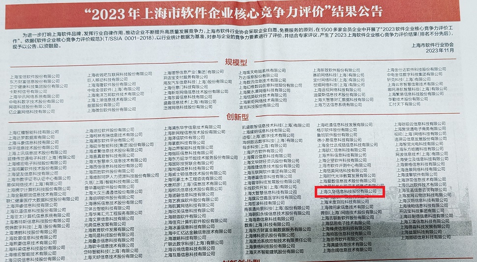 “2023软件企业核心竞争力评价活动”由上海市软件行业协会开展,该评选活动依据《软件企业核心竞争力评价规范》,以行业统计数据为基准,对参与软件企业的规模、经营能力、产品竞争力、技术创新能力、质量保证能力、行业资质等竞争力要素进行综合评价,并结合专家评议,最终产生评选结果。本次获得“2023年上海市软件核心竞争力企业(创新型)”证书,是对上海久华产品技术领先程度、研发创新能力等多方面综合实力的权威认可。此次评定结果公示在2023年12月1日出版的《文汇报》上。