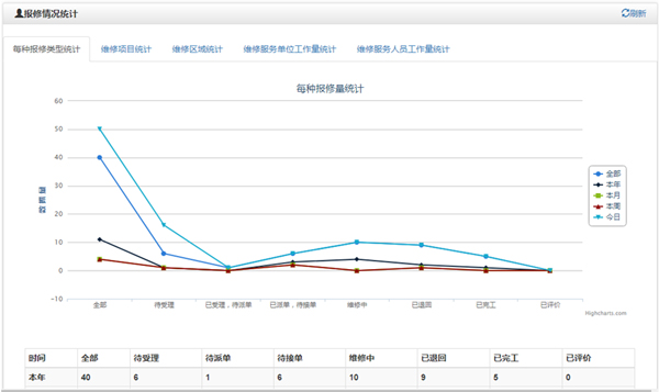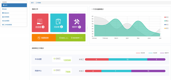可以根据报修区域、报修项目、承修单位、维修工等统计报修量,图表展示各类报修情况。