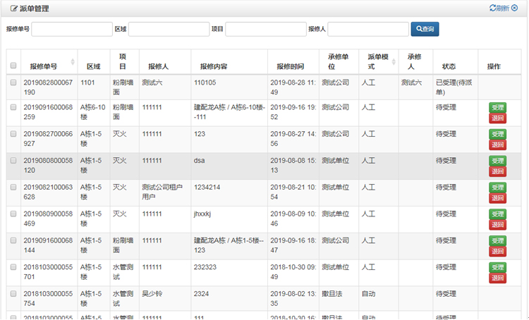 派单人查看报修单后,如果发现不属于报修范围,把报修单退回,退回时需填写退回原因,系统给申请人发送通知。维修工到现场查看后发现报修单维修项目选择错误的, 可以重新选择维修项目,按新的维修项目转给新的维修单位处理。