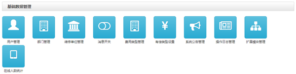 维修区域管理、维修项目管理、部门管理、维修服务单位管理、用户管理、维修服务单位管理员设置、维修服务单位设置、维修服务单位服务范围设置、维修服务人员服务范围设置、收费类型设置、消息设置、系统公告等。